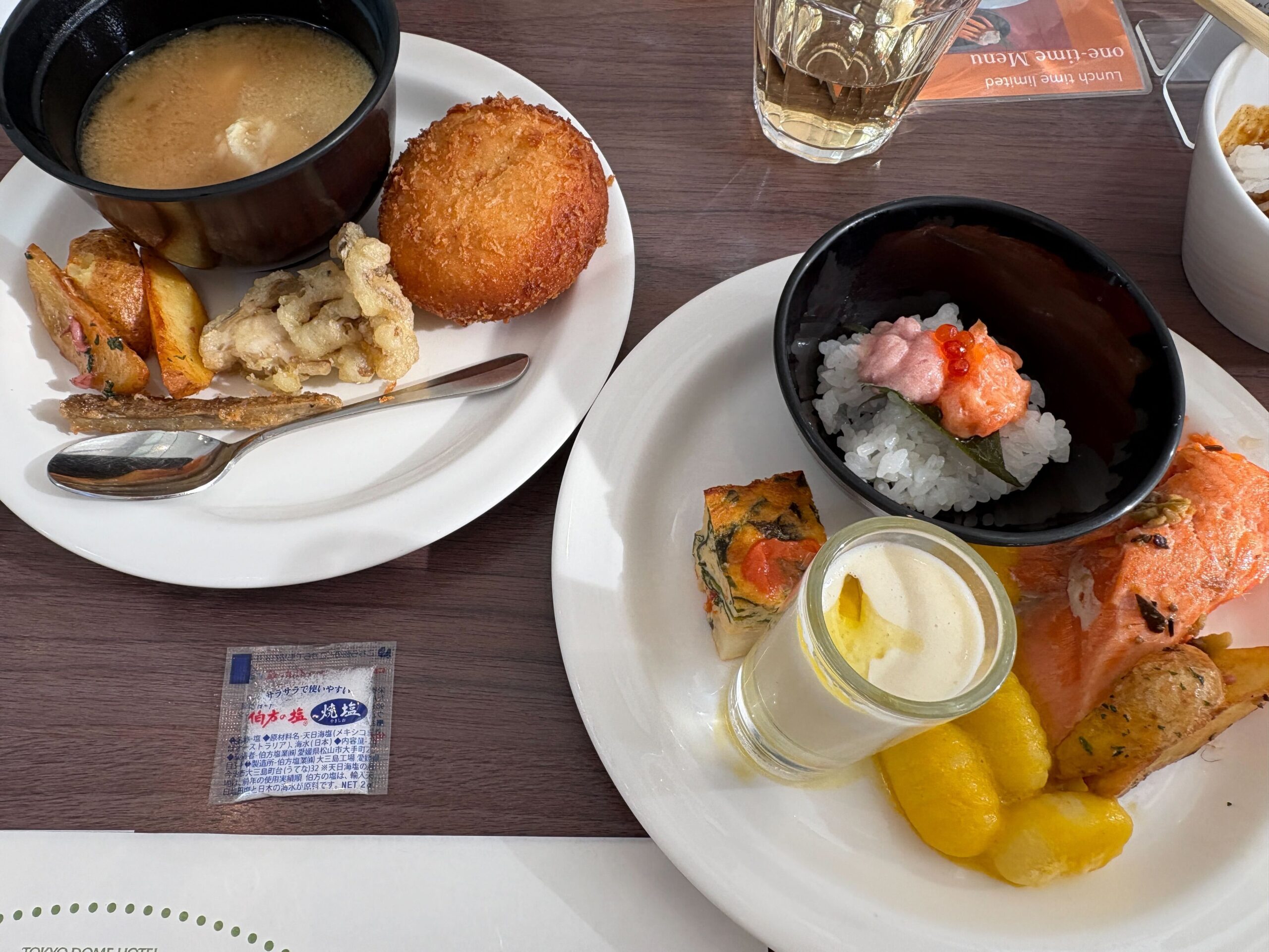 さて、実際の食事ですが、会場では「北海道フェア2025」が開催されていました。ホテルのシェフの方々が「走行距離1000kmを超える食材探しの旅」と称し、北海道の道南エリアなどを訪れて食材を厳選されたそうです。海鮮丼や味噌ラーメン、カニ汁、シーフードパエリアなど、まさに北海道を満喫できる内容でした。さらに、特別にズワイガニ一肩、またはホタテの殻焼きのどちらかを選んでいただくこともできました。